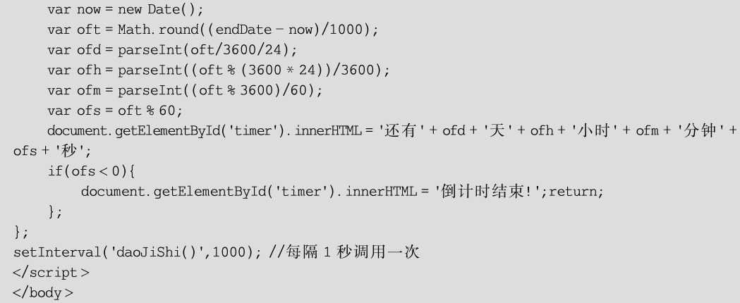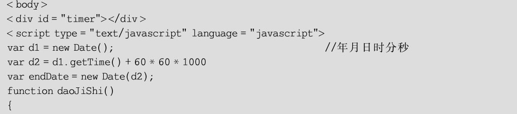 例如,下面代码用setInterval()函数实现1小时倒计时。
