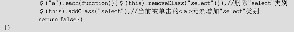jQuery代码中$("a")选择所有的元素,在元素的单击事件中,each()方法遍历所有的元素并删除元素上的"select"类别。$(this)代表当前被单击的元素,$(this).addClass("select")是给当前被单击的元素增加"select"类别。