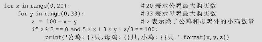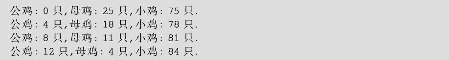 (2) 编写程序,计算百钱买百鸡问题。假设公鸡5元一只,母鸡3元一只,小鸡1元三只,现在有100元钱,想买100只鸡,问有多少种买法?