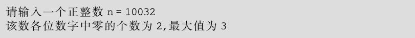(3) 输入一个正整数,统计该数的各位数字中零的个数,并求各位数字中的最大者。例如,输入10032,则输出为:零的个数为2,最大值为3。