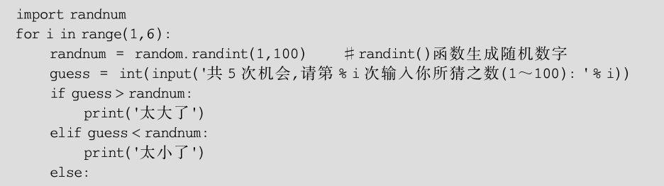 (4) 猜数字游戏:随机生成一个1~100的数字 randnum,用户猜测一个数字 guess,如果guess > randnum,打印“太大了”,如果 guess < randnum,打印“太小了”,如果 guess 等于randnum,打印“恭喜”,并且退出。用户总共有5次猜数字的机会,超过5次就打印“失败”,并且退出。