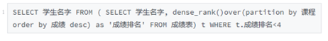 窗口函数:聚合 排序函数 OVER (PARTITION BY…ORDER BY…)。此函数可解决复杂业务问题,如常见的 TOP N 问题:找出每个课程成绩前三的学生,需要按课程分组对学生按成绩排名,再从中找出排名前三的学生: