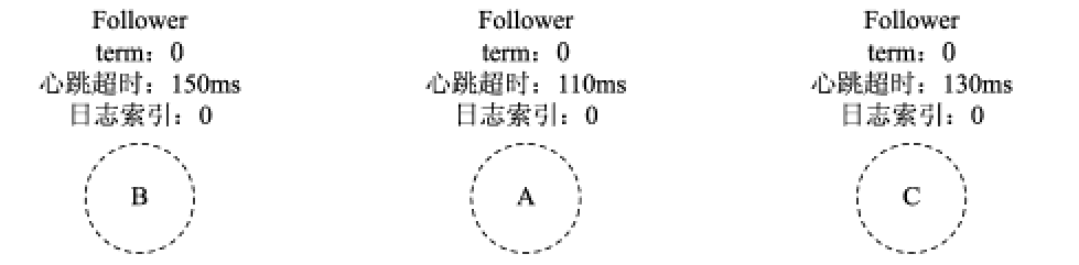 存在A、B、C三个成员组成的Raft集群,刚启动时,每个成员都处于Follower状态,其中,成员A心跳超时为110ms,成员B心跳超时为150ms,成员C心跳超时为130ms,其他相关信息如图1所示。