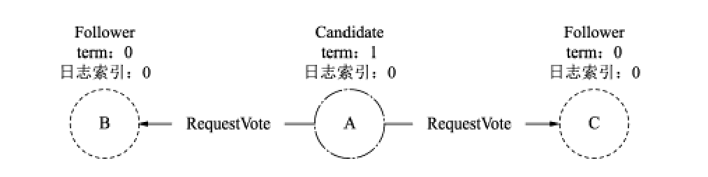 成员A通过RequestVote广播自己的选票给成员B、C,选票描述了成员A所拥有的数据,其包含成员A所处的term及最新的日志索引。成员B、C根据投票规则处理RequestVote消息。