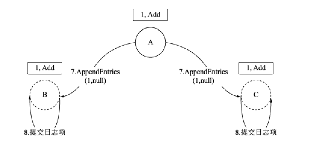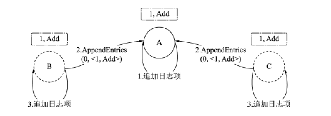 (2)Leader通过AppendEntries(0, <1, Add>)消息时将日志项广播给所有的Follower。其中: