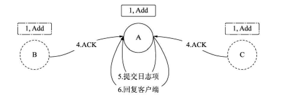此时,成员A、B、C都拥有日志项Add且都已在索引为1上完成了持久化。Follower在处理完AppendEntries消息后需要回复ACK消息给Leader,代表接受该日志项。Leader收到多数派的ACK消息后,可以在本地提交该日志项并执行状态转移,之后将执行结果返回给客户端,如图5所示。