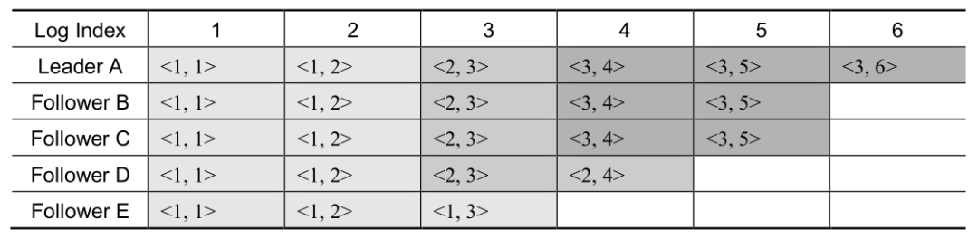 我们使用<term, logIndex>表示一个日志项,如表1所示为Follower E的日志索引3和Follower D的日志索引4,与当前Leader处理不一致的情况。出现这种情况可能是Follower E和Follower D曾经当选过Leader,并且在自己的term上提出了日志索引为3和4的日志项后立即宕机造成的。