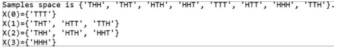 【例14.1】将一枚硬币抛掷三次,观察正面和反面出现的情况,样本空间是S={HHH,HHT,HTH,THH,HTT,THT,TTH,TTT}。以X记三次投掷得到正面H的总数,那么,对于样本空间S中的每一个样本点e,X都有一个数与之对应。X是定义在样本空间S上的一个实值单值函数,它的定义域是样本空间S,值域是实数集合{0,1,2,3}。这样的X称为随机变量。