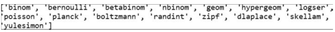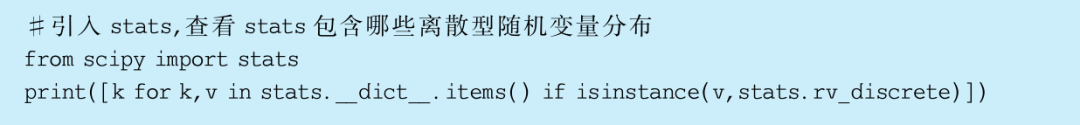首先引入stats,查看stats包含哪些离散型随机变量的分布,代码如下: