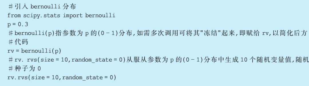 则称X服从参数为p的(0-1)分布或伯努利分布。scipy中bernoulli()对应(0-1)分布,代码如下: