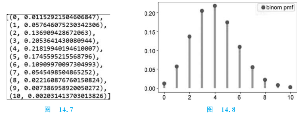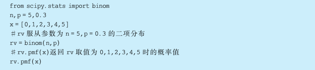 称X服从参数为n,p的二项分布。scipy中binom对应二项分布,使用方法代码如下: