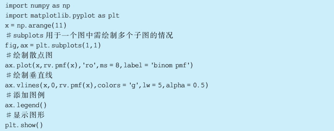 (3) ax. vlines(x,0,rv.pmf(x),colors='g',lw=5,alpha=0.5)在x处绘制从0到rv. pmf(x)的垂直线,线条颜色为绿色,线条宽度为5,透明度为0.5。