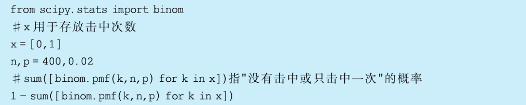 【例14.3】某人进行射击,设每次射击的命中率为0.02,独立射击400次,试求至少击中两次的概率。