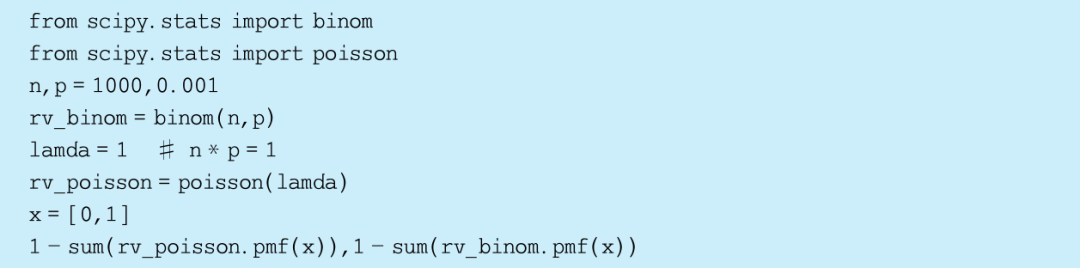 解由题可知,产品中的次品数服从参数为n=1000,p=0.001的二项分布,这里n很大,p很小,该二项分布可用参数为n、p的泊松分布来逼近,我们尝实验证这一结论,代码如下:
