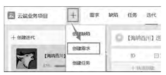 当前位于项目内其他页面上时,也可以单击项目导航栏中的+号图标,快捷跳转至需求创建页面,如图9-11所示。