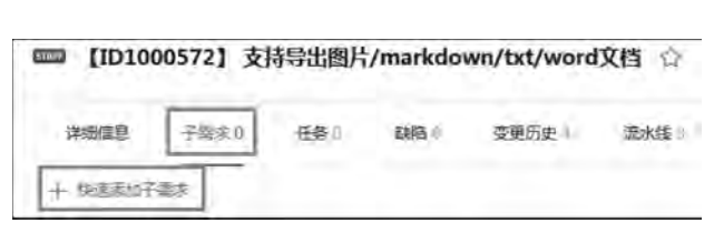 TAPD支持多层需求结构。当一个需求颗粒度过大时,可以通过创建子需求进行细化需求。在需求列表中,单击左侧下拉按钮,即可进行创建或快速创建,如图9-13和图9-14所示。