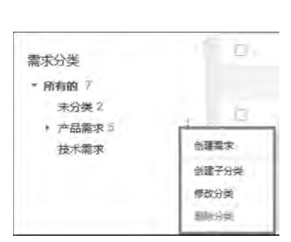 在需求页面左侧的需求分类栏中,单击分类标题右侧下拉按钮,即可创建子分类、修改或删除分类,如图9-16所示。