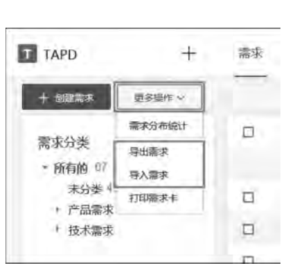 在需求列表上方,单击“更多操作”,在下拉选项中选择对应选项,即可进行需求的批量导入与导出,如图9-17所示。