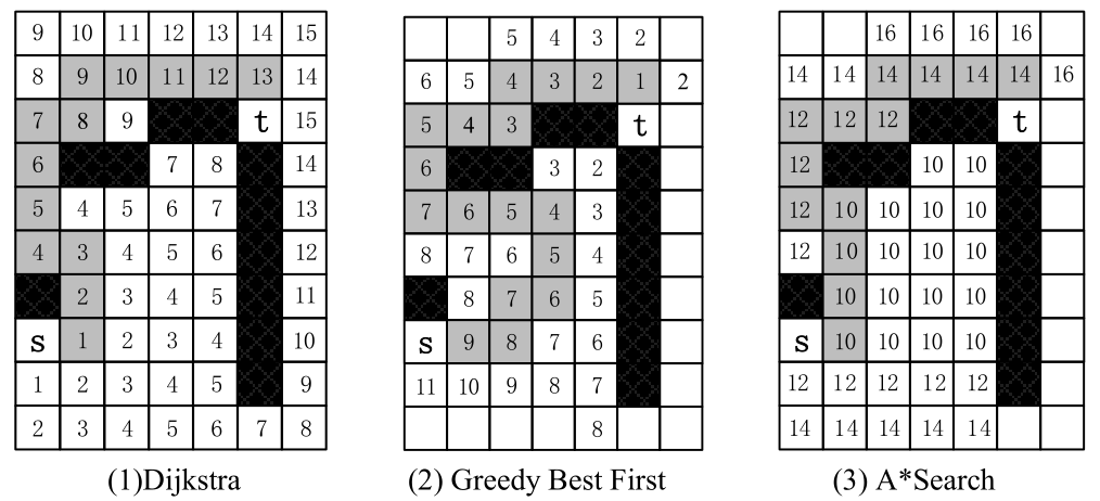 (1)Dijkstra(BFS)算法。格子中的数字,是从起点s到这个格子的最短距离。算法搜索格子时,把这些格子到起点的距离送入优先队列,当弹出时,就得到了s到这些格子的最短路径。最后,当终点t从优先队列弹出时,即得到s到t的最短距离14。