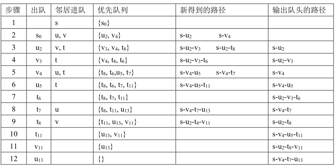 从第二列的“出队”可以看到,共产生10个路径,按从短到长的顺序排队输出。从起点s到终点t共有4条路径,t在第7、8、9、10步出队的时候,输出了第1、第2、第3、第4路径。表格中也列出了s到每个结点的多个路径和它们的长度,例如s-u有3个路径,s-v有3个路径。