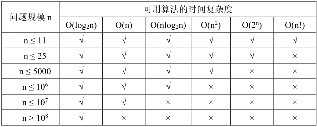 竞赛题的限制时间一般是1s,对应普通计算机计算速度是每秒千万次级,现在有些判题系统是每秒上亿次,不过为了保险,一般还是按千万次估算复杂度。通过上述时间复杂度可以换算出能解决问题的数据规模。例如,一个算法的复杂度为O(n!),当n=11时,11!=39916800,这个算法只能解决n≤11的问题。