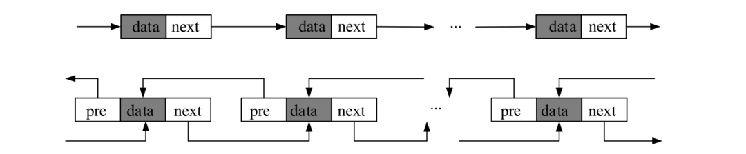链表的各结点首尾相接,最后的next指针指向第一个data,第一个的pre指针指向最后的data。单向链表只有一个遍历方向,双向链表有两个方向,比单向链表的访问方便一点,也快一点。在需要频繁访问前后几个结点的场合,可以使用双向链表。