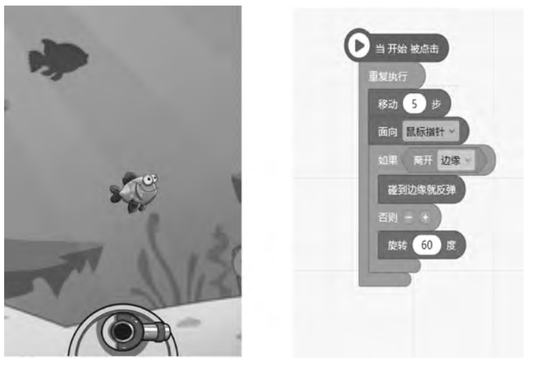 如图2-17所示,这是编程猫上的一个游戏案例,需要控制图中的小鱼在“海里游泳”。利用鼠标的指针可以控制小鱼的动作,如果它触碰到边界就立即反弹,在没有触碰边界的时候可以给它设置60°的旋转,这样更符合小鱼游泳的姿态。
