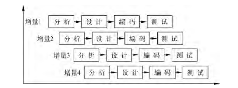 增量模型是把待开发的软件系统模块化,将每个模块作为一个增量组件,从而分批次地分析、设计、编码和测试这些增量组件。增量模型本质上是迭代的,但与原型模型不一样的是其强调每一个增量均发布一个可操作产品。早期的增量是最终产品的“可拆卸”版本,但提供了为用户服务的功能,并且还提供了评估的平台。增量模型如图1-3所示。