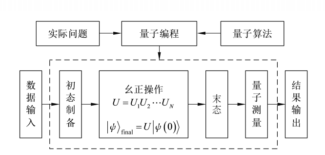 图1.2中虚框内示意的是量子程序对应的量子线路的执行过程,分为三个基本步骤: 初态制备、幺正变换和对末态进行量子测量。在|ψ〉final=U|ψ(0)〉中,|ψ(0)〉为量子线路的初态,执行整个量子线路相当于执行其对应的酉变换U,从而得到末态|ψ〉final。U=U1U2…UN代表量子线路由N个量子门U1,U2,…,UN组成。需要注意的是,UN是最靠近初态的门。
