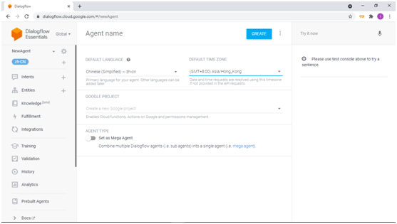 (2) 单击Create Agent按钮,打开如图8-4所示代理创建页面,选择默认语言、默认时区,并选中创建新项目,然后单击CREATE按钮,生成一个新的代理。