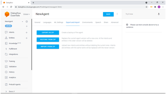 (3) 在左边导航窗口中选择新生成的代理名字,然后单击Export And Import标签,单击IMPORT FROM ZIP按钮打开模板选择窗口,选中预先下载的客服模板文件后上传到对话流系统。