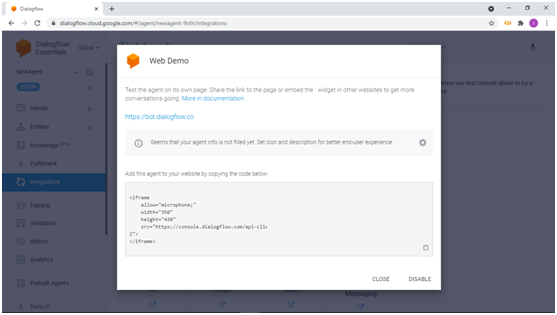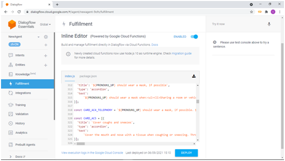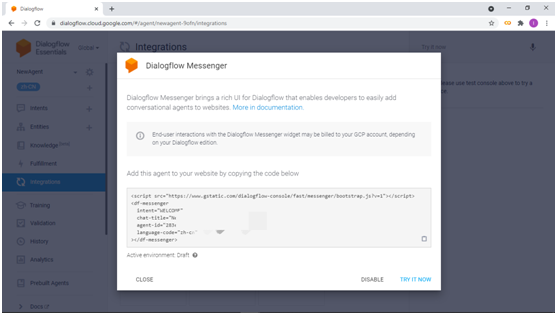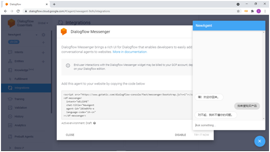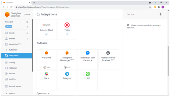 (8) 选择Integrations,在打开的页面上选择Dialogflow Messenger,将智能客服程序集成部署到用户接口中,单击TRY IT NOW,参见图8-9。