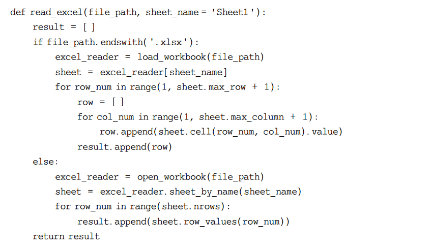 从以上代码可以看出,由于需要兼容.xlsx和.xls两种后缀的Excel文件,read_excel()函数对文件后缀作了判断,如果是以.xlsx作为后缀的Excel文件,就使用openpyxl,否则使用xlrd。对比openpyxl和xlrd可以看出,前者API更为复杂,获取一行数据需要使用行号和列号;而后者只需要行号即可。默认读取的Sheet是Sheet1。
