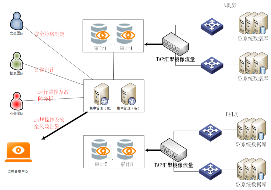 安华金和采用分布式部署方式,通过“八台数据库安全审计系统+两台集中管理系统”,实现了对数据库运维侧及应用侧操作记录审计的全覆盖,可供应用数据库系统管理员、审计人员、安全人员等进行查看,并通过数据库审计日志发现异常、违规操作及攻击类安全事件等,从而掌握数据库运行情况。