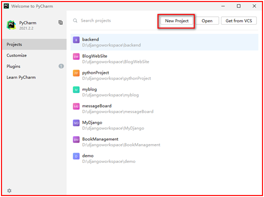 启动PyCharm,如图C-1所示,单击New Project,结果如图C-2所示。如图C-2所示,选择Django类型项目,并输入或选用默认的项目位置,单击Create按钮就可以成功的创建Django项目。