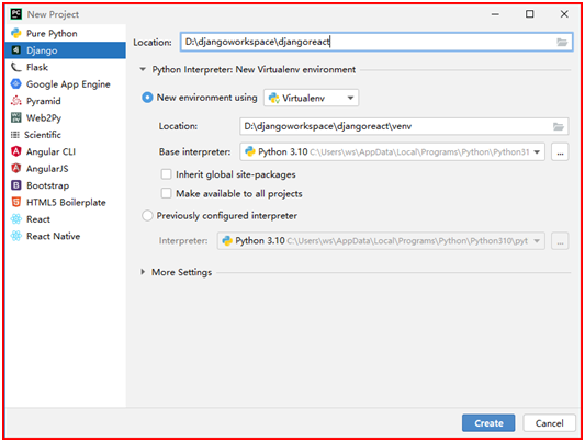 ■ 图C-2 选择Django类型项目并输入项目位置的界面
