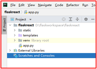 启动PyCharm,如图C-1所示,单击New Project,结果如图C-3所示。如图C-3所示,选择Flask类型项目,并输入或选用默认的项目位置,单击Create按钮就可以成功的创建Flask项目。项目创建完成后的目录结构如图C-4所示。注意初始创建时,目录static和template为空。