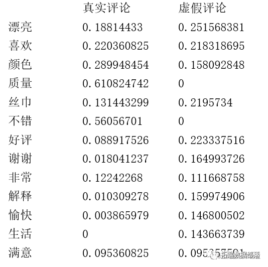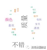 从词频云图可以看到,真实的评价中的主要关键词是质量,不错,色差等,从这些关键词来看,本文可以推测这类用户主要看重的是商品的功能性和质量型,并且主要集中在一些基本的特征,如质量、色差。也可以推测这些用户的商品评论没有太多华丽的词汇,而只是简单的不错,谢谢等。因此,可以认为真实的评论一般比较简单,并且会有一些对商品具体的方面的不足进行描述如色差,而不是一味的非常好、喜欢、愉快等。