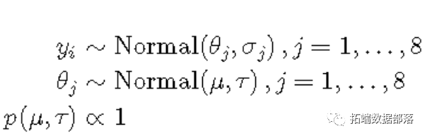 因此,需要另一个模型。分层模型的优点是可以合并来自所有八所学校的信息,而无需假定它们具有共同的真实效果。我们可以通过以下方式指定层次贝叶斯模型: