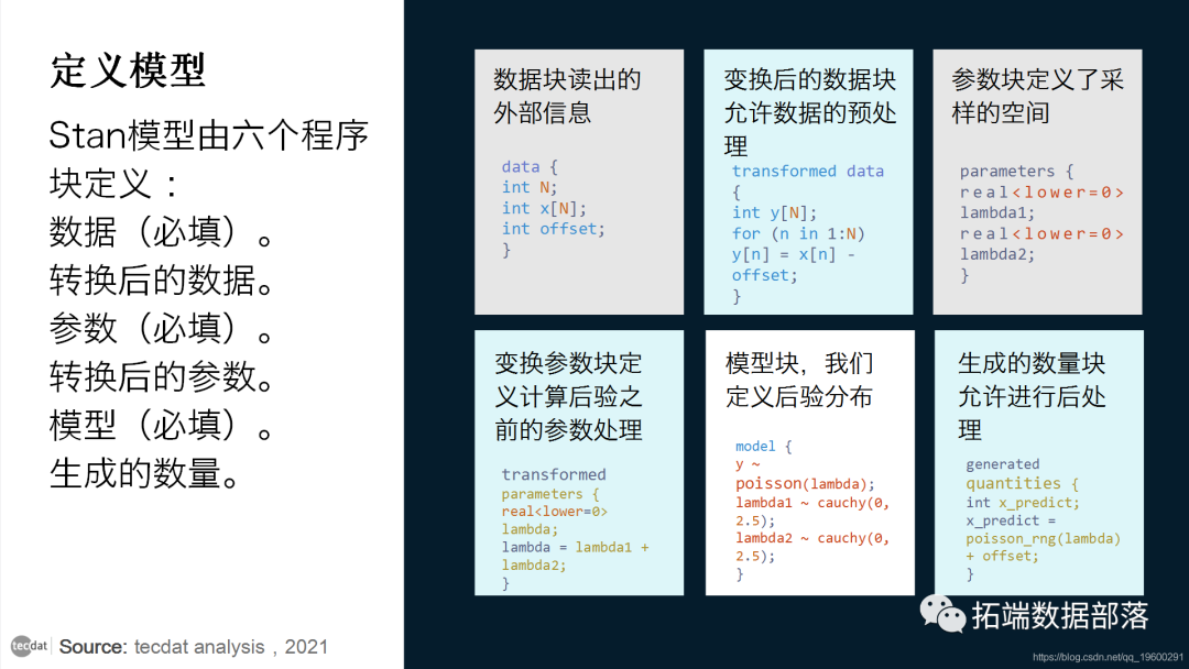在指定了要使用的模型之后,我们现在可以讨论如何在Stan中指定此模型。在为上述模型定义Stan程序之前,让我们看一下Stan建模语言的结构。