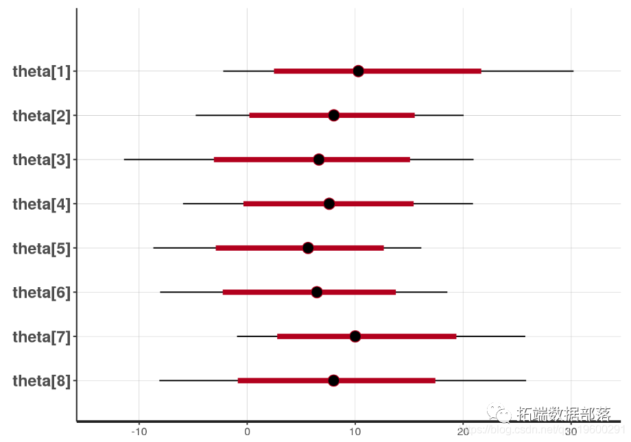 在此,行名称表示估计的参数:mu是后验分布的平均值,而tau是其标准偏差。eta和theta的条目分别表示矢量η和θ的估计值。这些列表示计算值。百分比表示置信区间。例如,教练计划的总体效果的95%可信区间μ为[-1.27,18.26]。由于我们不确定平均值,因此θj的95%置信区间也很宽。例如,对于第一所学校,95%置信区间为[−2.19,32.33]。