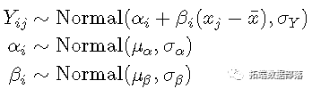 第i个大鼠的截距由αi表示,斜率由βi表示。注意,测量时间的中心是x = 22,它是时间序列数据的中值测量值(第22天)。