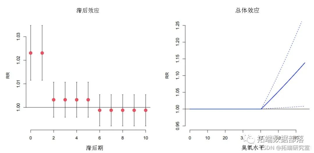图1:在阈值(40.3 µgr m3)以上的臭氧增加10个单位时,滞后效应(左)和总体效应(右)对死亡率的影响。