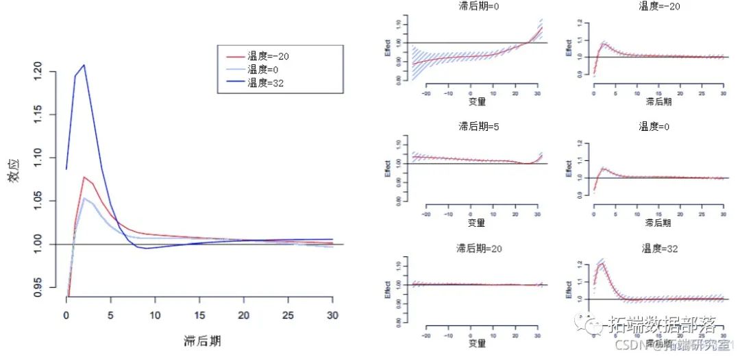 图3(左)显示了由plot()和lines()中的参数var选择的温度值的预测滞后效应影响。另外,图3(右)显示了针对特定滞后的沿温度的预测效应的多重曲线图(左),以及图3(右)中绘制的相同滞后效应,以及99%的置信区间。