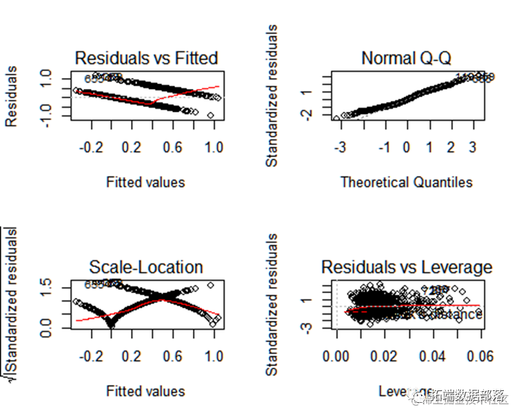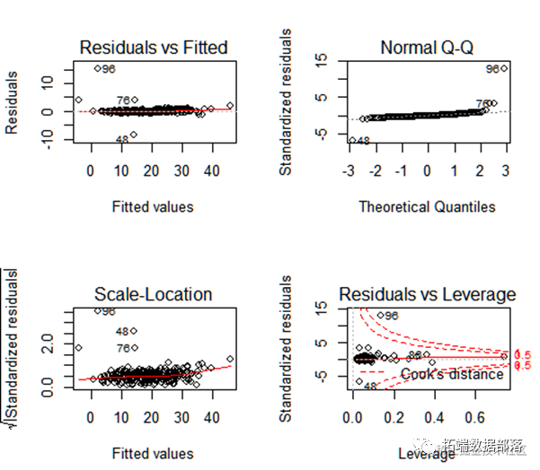 残差分析可以对回归模型的假设条件即随机误差项是否独立同分布进行检验,同时还可以找出离群点。命令语句为plot(lm.1),显示结果如下