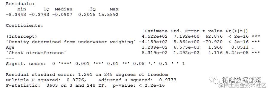 由于P<0.05,于是在α=0.05水平下,本例的回归系数有统计学意义,体重、年龄、胸围和体脂存在回归关系。