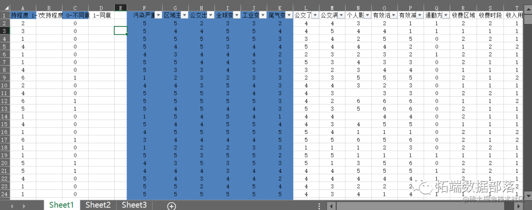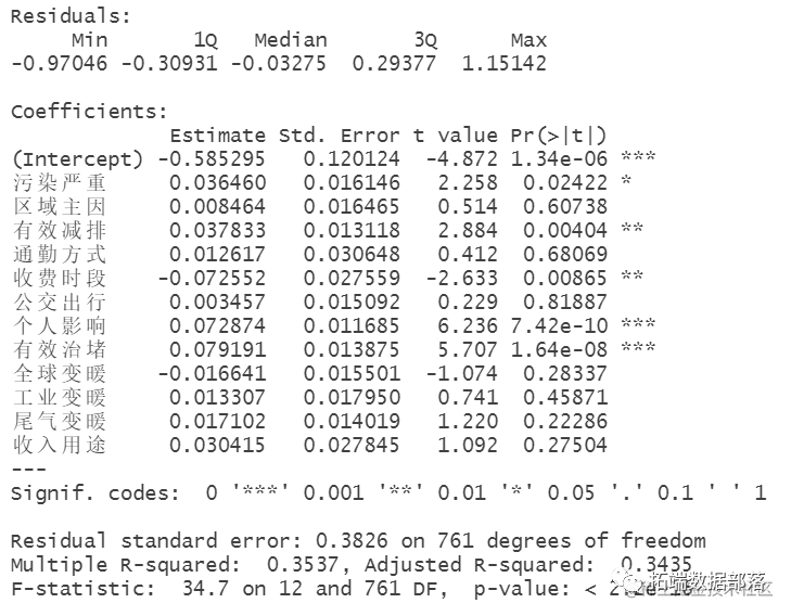 由于P<0.05,于是在α=0.05水平下,本例的回归系数有统计学意义,污染严重、有效减排、收费时段、个人影响和有效治堵和支持程度存在回归关系。