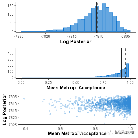两个图都显示残差是右偏的。因此,IQ(因为它目前存在于数据集中)不应用作贝叶斯预测模型。但是,对 仅具有正值的偏斜_因_变量使用(自然)对数变换 通常可以解决问题。下面,该模型使用转换后的工资变量进行了重新拟合。
