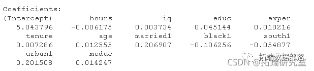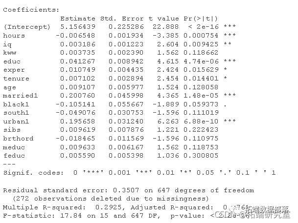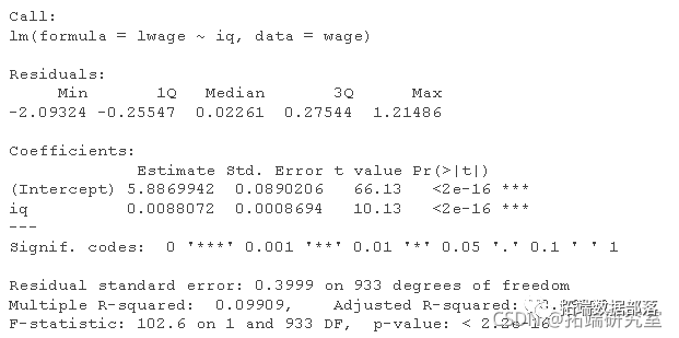 残差确实大致呈正态分布。然而,由此产生的 IQ 系数非常小(只有 0.0088),这是可以预料的,因为 IQ 分数提高 1 分几乎不会对工资产生太大影响。需要进一步细化。数据集包含更多信息。