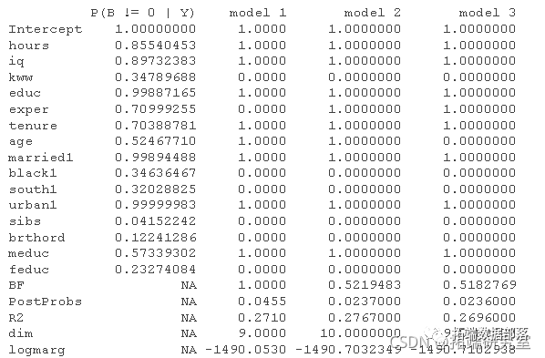 在本文中,贝叶斯模型提供了变量选择技术,确保变量选择的可靠性。对社会经济因素如何影响收入和工资的研究为应用这些技术提供了充分的机会,同时也为从性别歧视到高等教育的好处等主题提供了洞察力(点击文末“阅读原文”获取完整代码数据)。